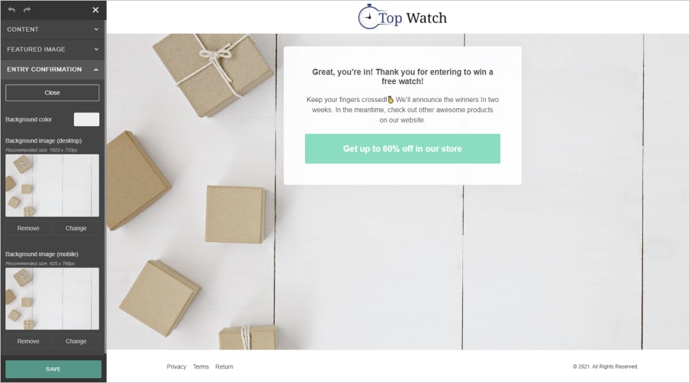 When your visitors hit the Enter now button, they will be redirected to the Entry confirmation page. This is a great place to experiment with some extra incentives. Why don’t you reward your visitors with a coupon code to encourage those who have already demonstrated interest in your store to discover your product range?