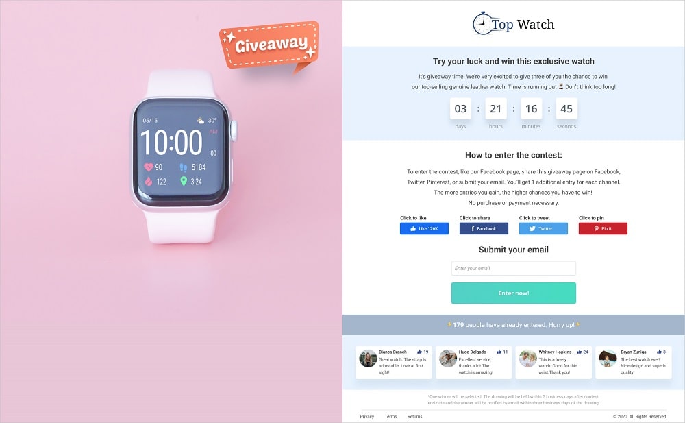 With the brand new Contest template developed for the Landing Pages add-on, you can create giveaways in just a few minutes. Have a look at the demo contest landing page.