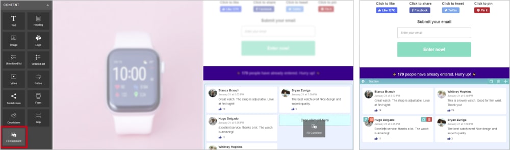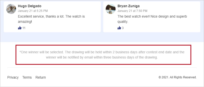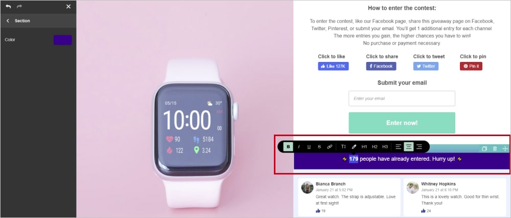 Everyone wants to make sure that a giveaway is trustworthy. So, don’t skimp on testimonials. They are a classic go-to hack you can enhance your brand credibility with. Hover over a comment to adjust it to your needs.