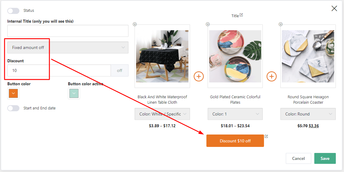 - Fixed amount off allows you to reduce the total price by a fixed sum. If you set $10, you’ll offer customers a simple $10 discount.