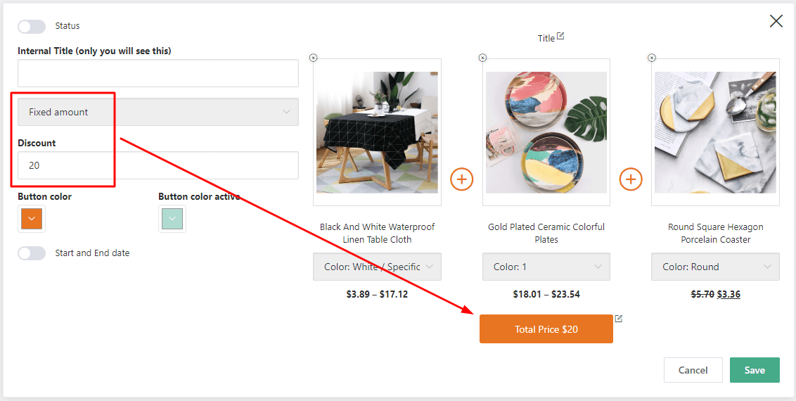 - Fixed amount type sets a fixed price for a given bundle. For example, if you set the bundle price to $20, the offer will always cost $20.
