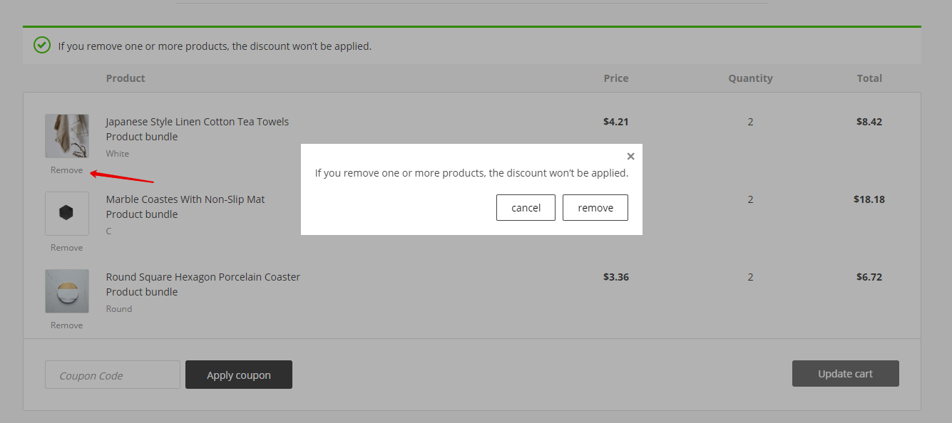If a customer decides to remove a bundle product from the cart, the system will automatically warn him or her that it will withdraw the offer as well.