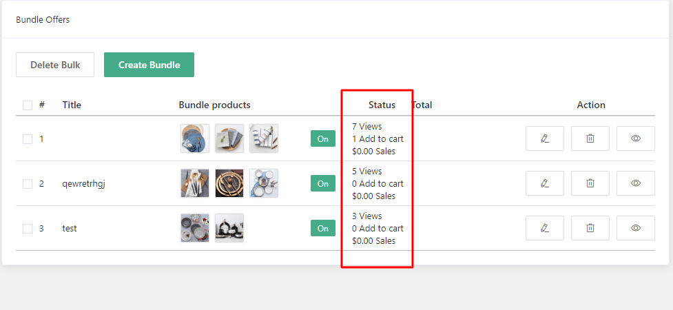 After installing the add-on on your dropshipping store, you will see it in the dashboard of your website. There you can see all the bundles you’ve created, their status and other statistics. Use this panel to edit, delete and view the existing offers, as well as create new ones.