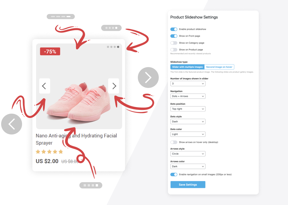 In your settings, you’ll find a few carousel navigation styles to jazz up your product listings. Dots or arrows? Hmm.. maybe both? Circle or square? Light or dark? Top left or bottom right? It’s your turn to decide 😉