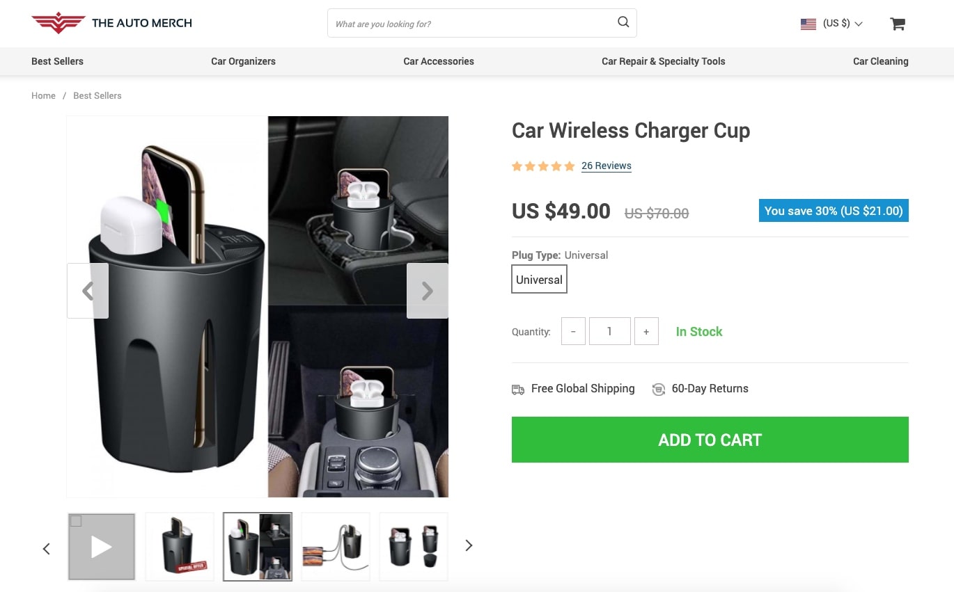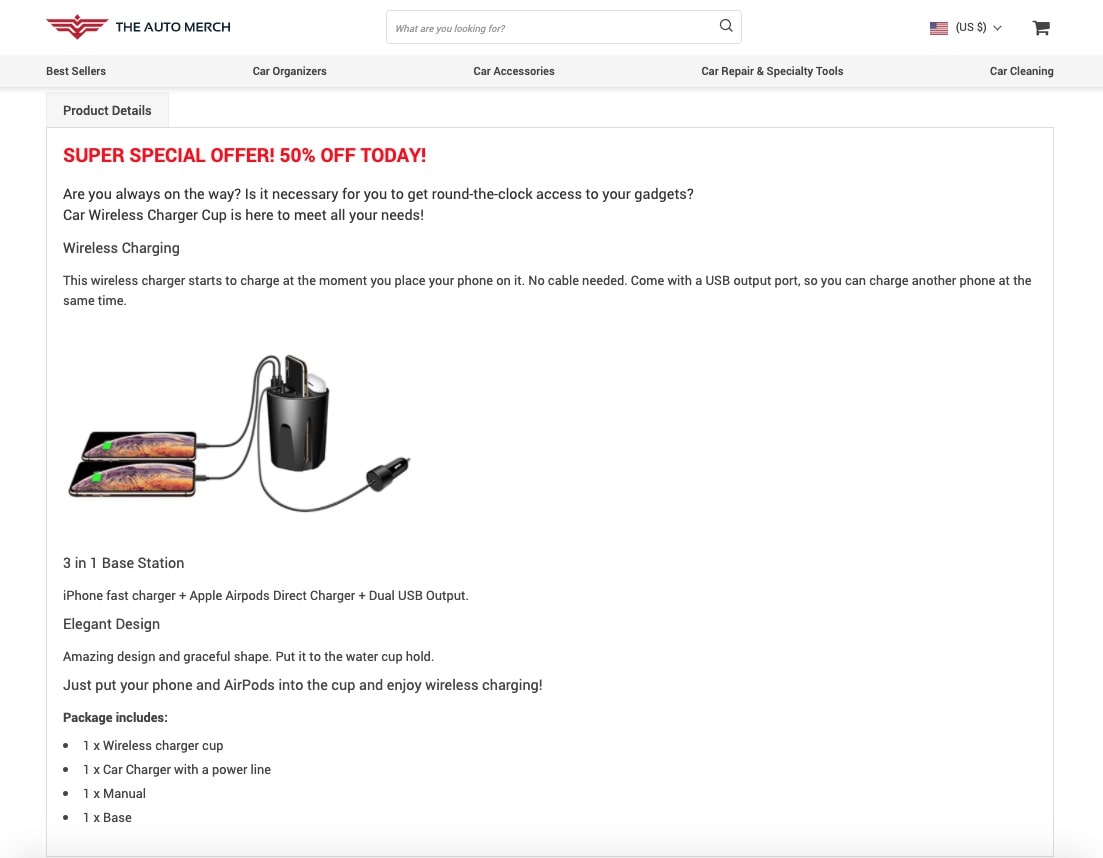 Actually, the story of this store starts with a limited number of items that could have a high ecommerce potential. One of the products the store creators have chosen is this very car charger.