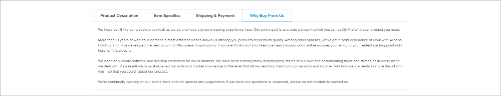 – ‘Why buy from us’ tab where you list all the buyers’ benefits of purchasing something from you.