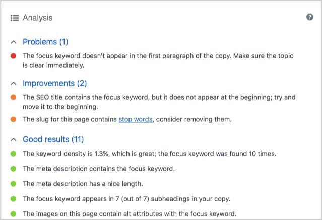 Make sure that all the elements contain the keyword you have set for this page, save your progress, and don’t forget to check the ‘Analysis’ section: it gives you hints on the ways to improve the page further.