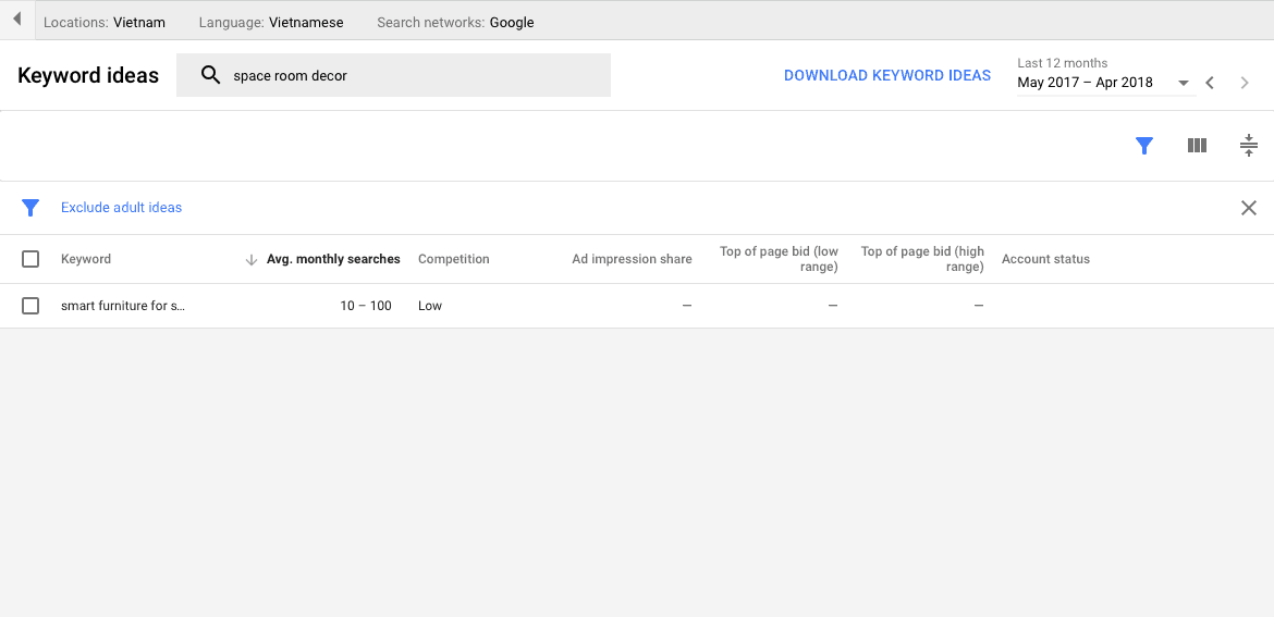 If you get a similarly poor result, don’t worry. Take a look at the “Location” and “Language” sections. In my example, the country is Vietnam, and the language is Vietnamese – but the language of the “space room décor” phrase is English! No wonder the system can’t detect anything suitable.
