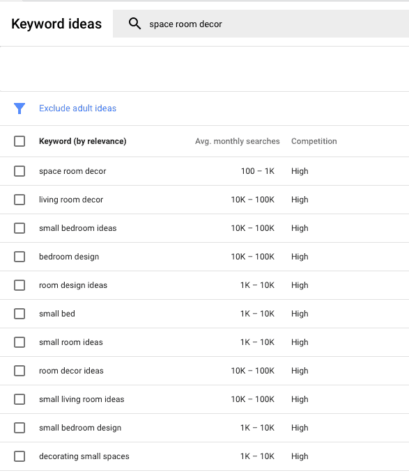 For a start, let’s try the following keyword: space room décor. To find out if it’s a good choice, we will use Google keyword planner.