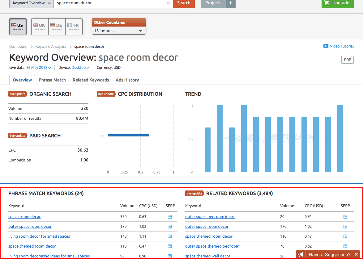 It means that people looking for outer space decor ideas also make these exact search queries, and do this commonly. In other words, Internet users type these word combinations in the Google search bar quite often, and that’s exactly what you need! By exploring this page section, you both get an idea of typically demanded products and get the opportunity to narrow down your keyword – which, obviously, makes it more specific and therefore, more likely to convert better.