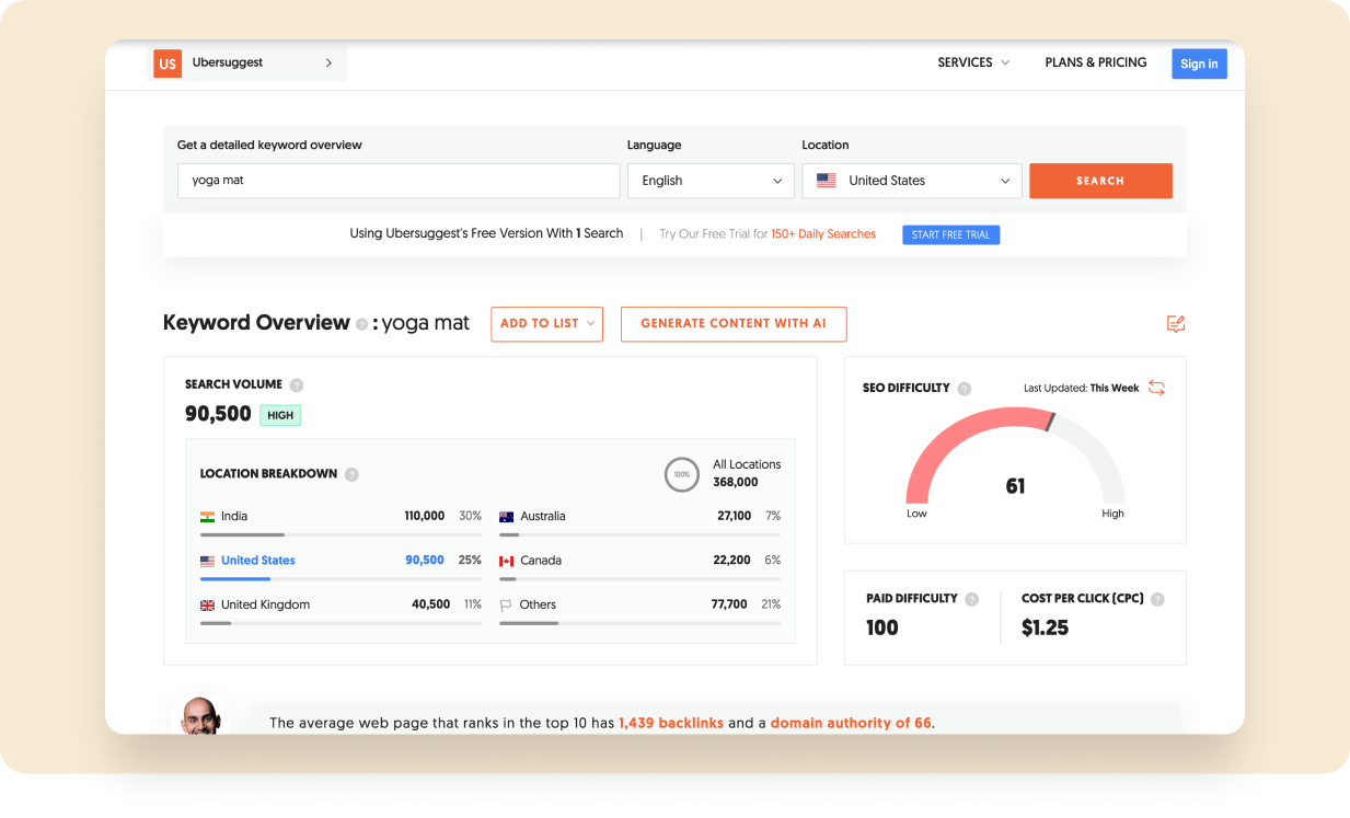 - Ubersuggest (free and paid): a beginner-friendly tool that provides keyword ideas, search volumes, and difficulty scores.