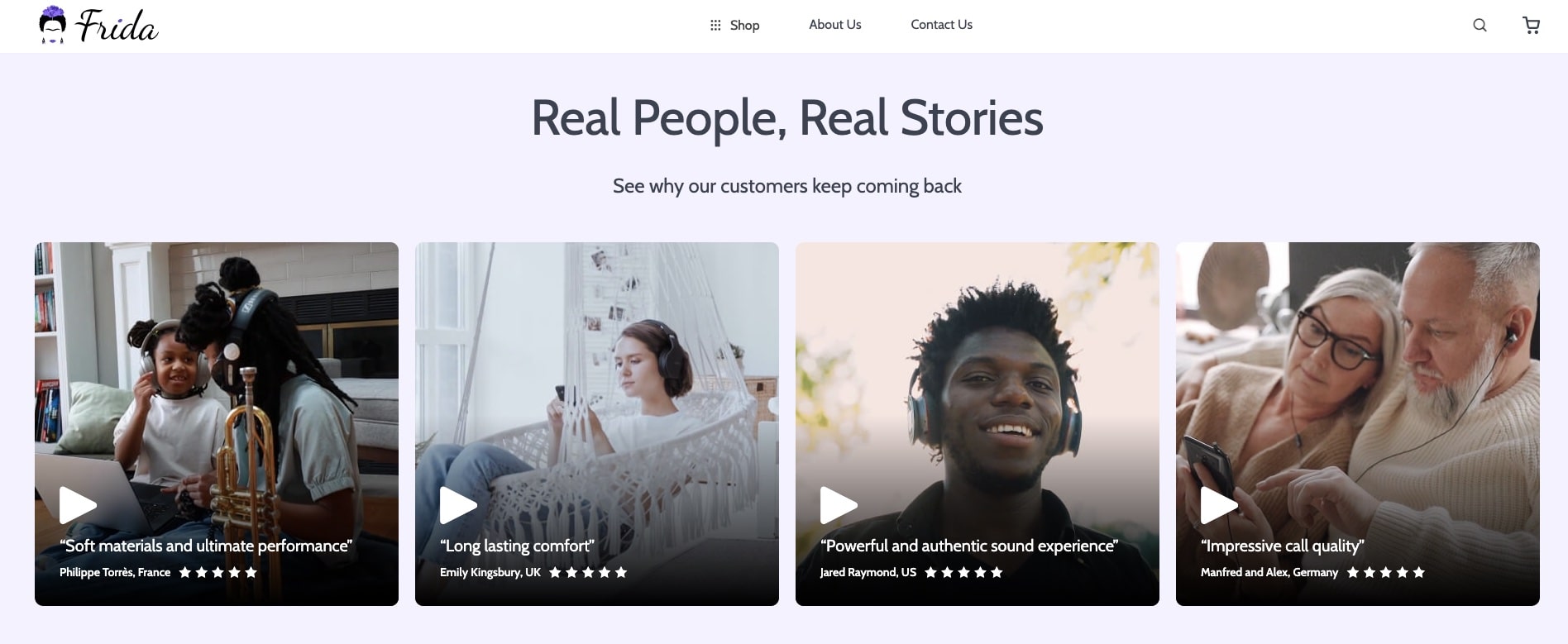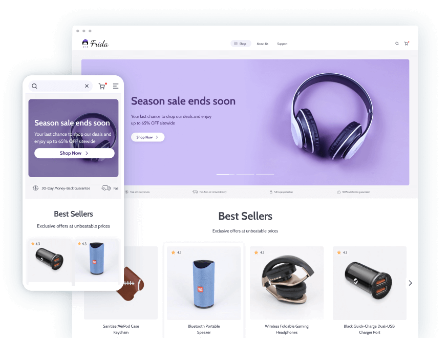 With the Frida theme, you can strike up incomparably more trusted relations with your customers. Moreover, it’s a chance to elevate your brand to greater heights by easily featuring video reviews on your Homepage. Profit!