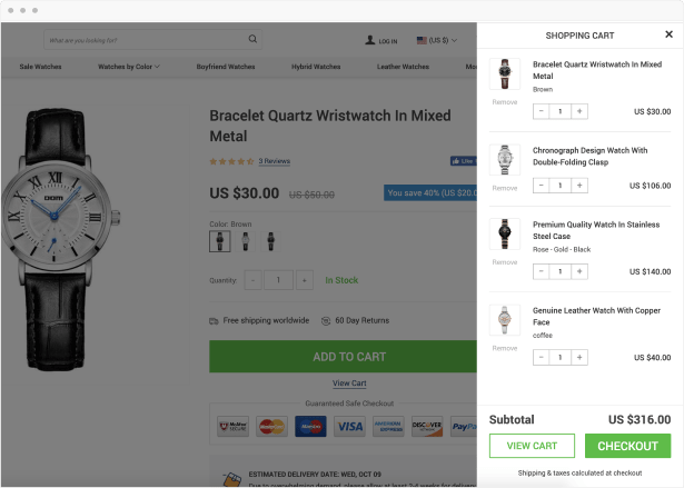 The shopping carts have been carefully crafted according to Baymard checkout research findings to provide unparalleled usability. Choose from 4 shopping cart options available for you to meet your business needs.