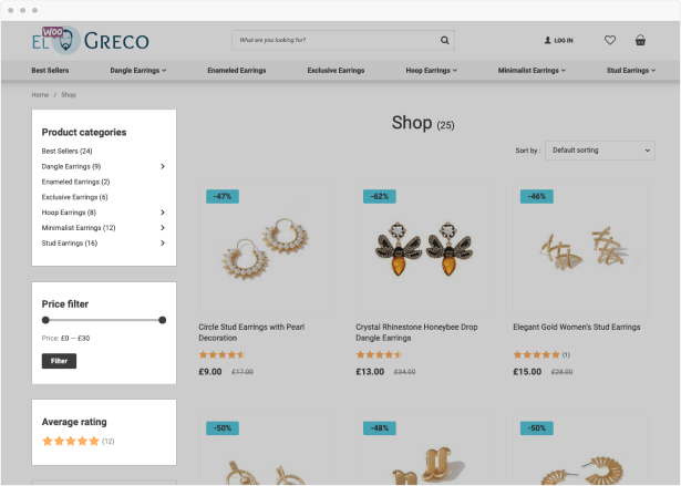 Add more options to your Shop page with handy sidebar widgets: product menu, price filters, average rating filters,  product search, and many more.