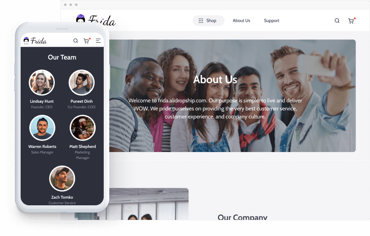 Frida offers a brand new About Us page to help you introduce your team on your own terms. By sharing your values, telling a story behind your goods and showing who creates them, you get another chance to build trust and create a strong bond with your customers.