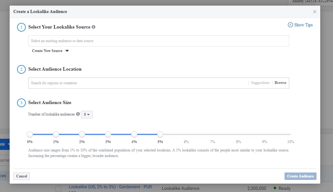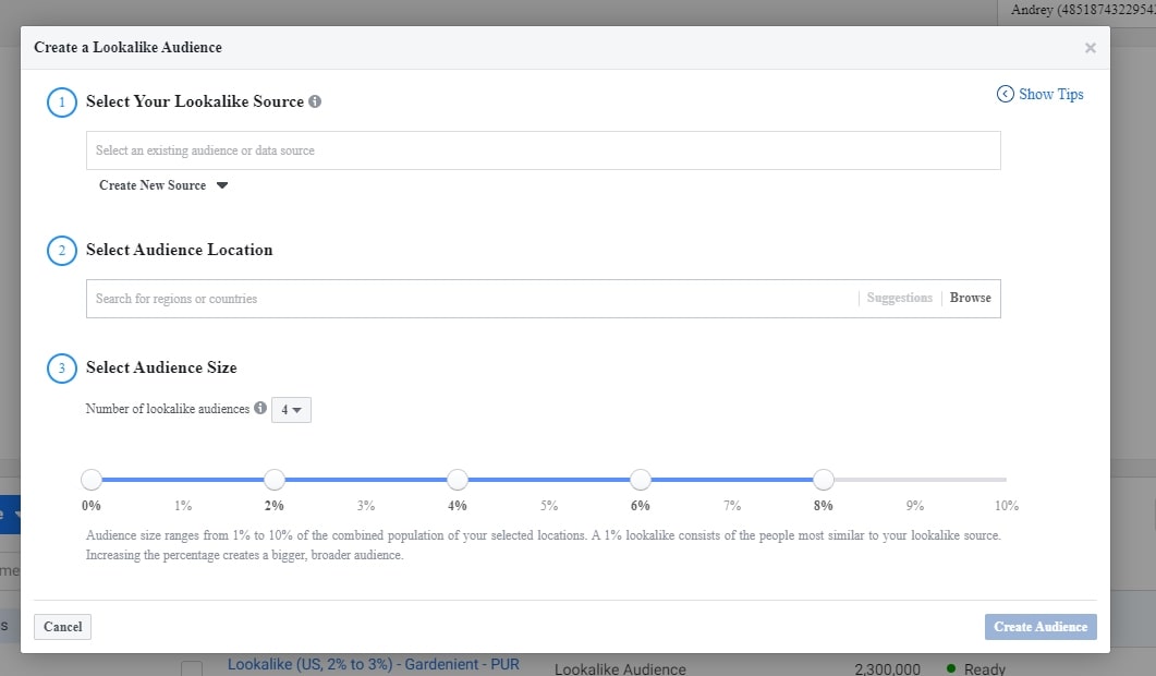 Here you can choose between 1% to 10% (similarity degree). The point is that 1% won’t necessarily convert better than 4%. In this case, your job is to find out which segment is the best. Our team usually tests 1-5% like you can see on the screenshot.