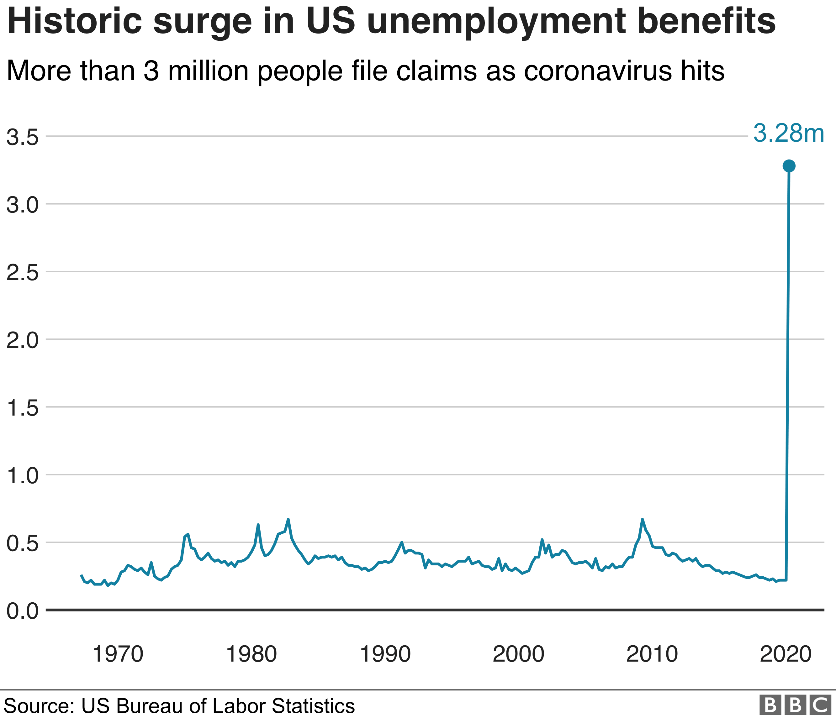 As quoted by BBC, according to The US Bureau of Labor Statistics, the number unemployed in the US has soared to 3.28 million people.